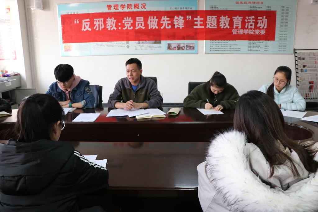 会上,孙旭春同志首先宣读了学校《关于开展“反邪教:党员做先锋”主题教育活动的通知》以及本科生党支部关于“反邪教:党员做先锋”主题教育活动实施方案,随后为同学们详细讲解了邪教的形式、特征和危害,并详述邪教和宗教的区别。他强调,作为新时代的大学生,尤其作为一名党员和入党积极分子,要坚定理想信念,树立正确的人生观、价值观和世界观;还要崇尚科学,以科学的态度对待一切;更要以身作则起到模范带头作用,远离邪教,以积极行动抵制邪教。会议最后,全体与会人员观看反邪教科教电影《回归警惕邪教侵害》,影片生动真实地揭示了邪教对个人、家庭以及社会产生的种种侵害。与会人员由此对邪教之于社会的危害有了更加深刻的认识,积极签订了反邪教承诺书,自愿成为反邪教的志愿者,加入传播科学文明的行列