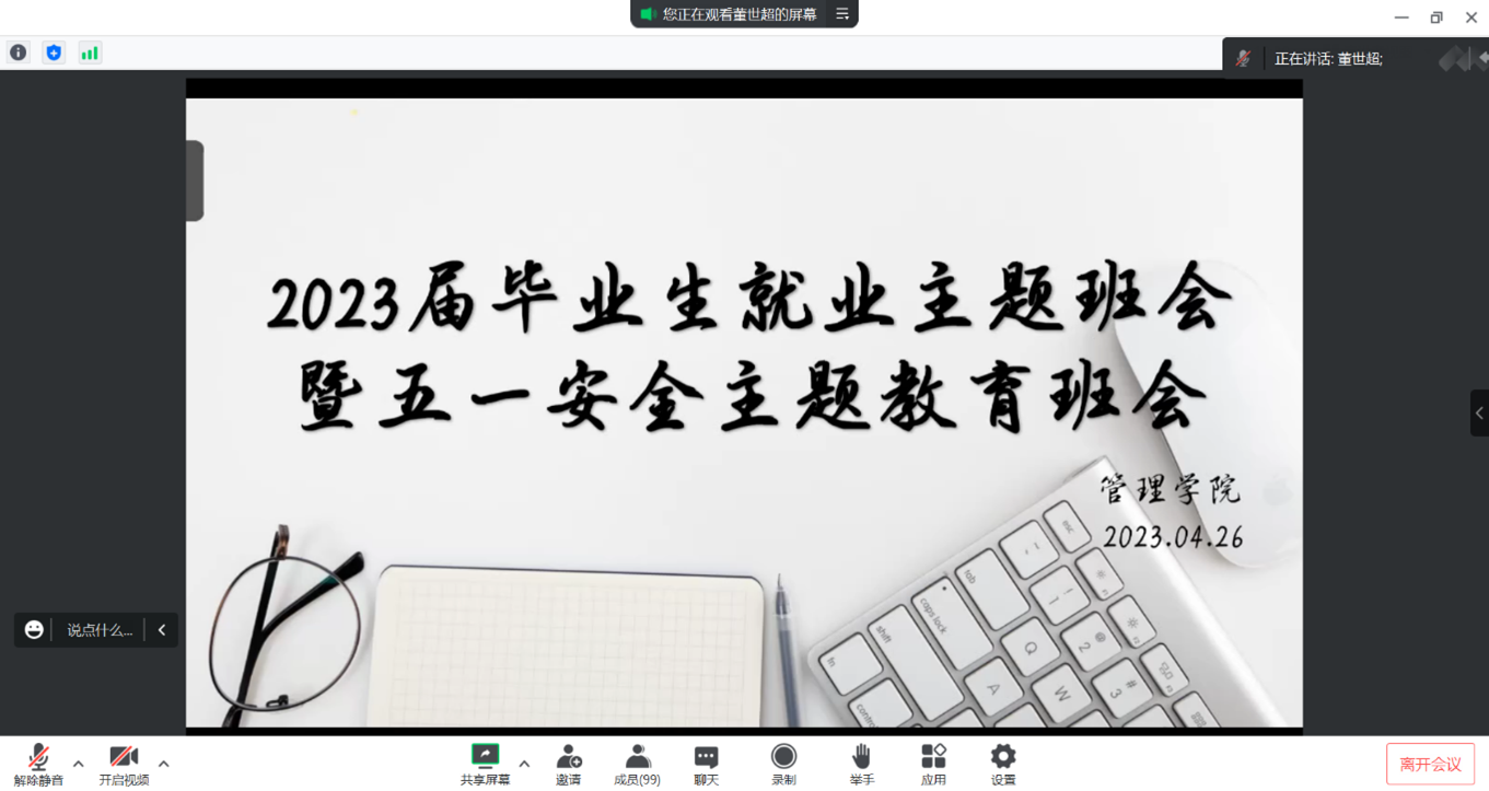4月26日,杏吧原创 顺利举行2023届本科毕业生就业暨五一安全教育主题班会,会议由2019级辅导员董世超主持,2019级全体同学参与此次会议。
