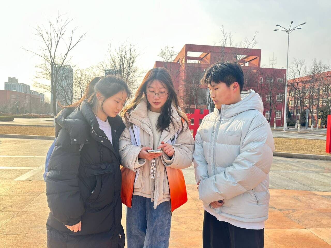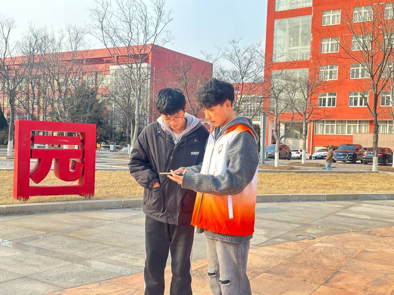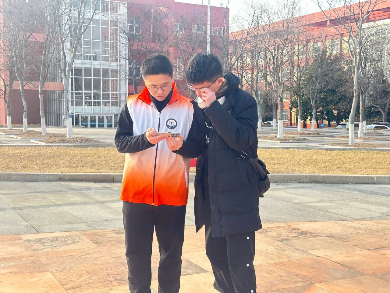 图为志愿者与同学观看视频