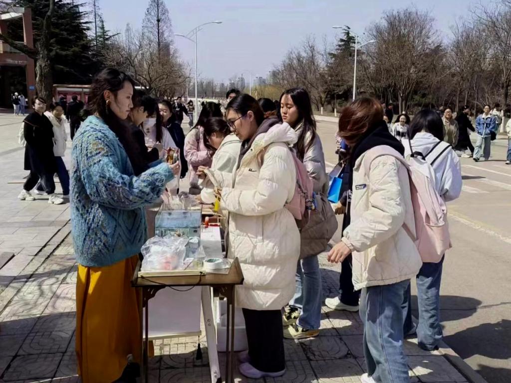 活动当天,协会于D楼事务大厅前设立临时展区,通过文化竞答与实践体验相结合的方式,向全校学生普及与花卉相关的传统民俗知识。此次活动内容丰富多样,涵盖飞花令游戏、鲜花饼品尝、花艺手工制作等多个环节。活动参与者还可以亲身体验非遗漆扇制作和传统插花艺术,从而深入领略传统非遗手工技术的独特魅力。