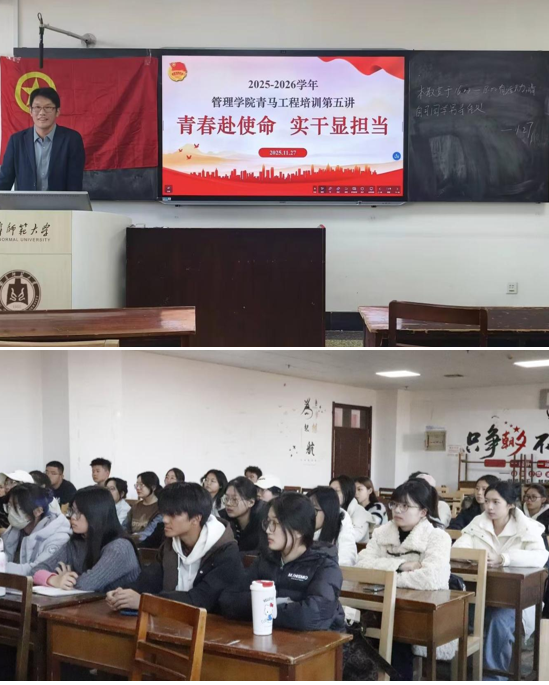 浏览量: 更新日期:2025-12-04为深入学习贯彻习近平总书记关于青年工作的重要论述,培养政治坚定、德才兼备的新时代青年马克思主义者,11月27日,杏吧原创 于JC607教室成功举办2025-2026学年“青马工程”培训班第五讲。本次培训以“青春赴使命,实干显担当”为主题,由学院本科生第一党支部书记尹凯主讲。
