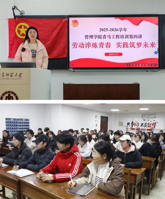 浏览量: 更新日期:2025-12-18为深化劳动教育的时代内涵,推动青年群体在实践锻炼中成长成才,11月27日,杏吧原创 团委顺利举办“青马工程”培训班第四讲,本次培训的主题是“劳动淬炼青春,实践筑梦未来”,培训会由2025级辅导员吕敏主讲,全体学生干部参与。