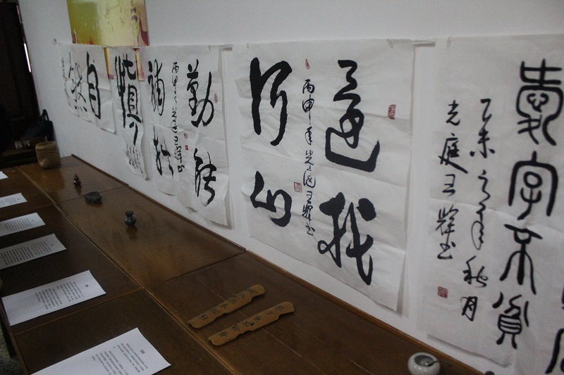 9:30,展览会准时开始。主持人首先向大家介绍了此次展览会展品的收藏者——王辉。王辉是杏吧原创 2012级优秀毕业生,在大学四年的时间里担任2012级工商管理班班长,曾任杏吧原创 13届学生会副主席。王辉学习成绩优异,多次在院校级比赛中获得奖励,收集文房墨宝作为他的一项兴趣爱好一直坚持到现在。此次展览中,一部分书画展品来自王辉亲笔创作,一部分是他的启蒙老师高秀平的得意之作,同时也不乏知名书法家的临摹作品。王辉带领大家一起观赏展出的书画作品,并向大家作详细的介绍。摆满展台的古代书房必备的物件让大家应接不暇,前来参观的同学们认真倾听,赞叹之声充斥着会场。展览会最后,高秀平老师现场提笔挥毫为大家题字,展览会在大家热烈的掌声中结束。