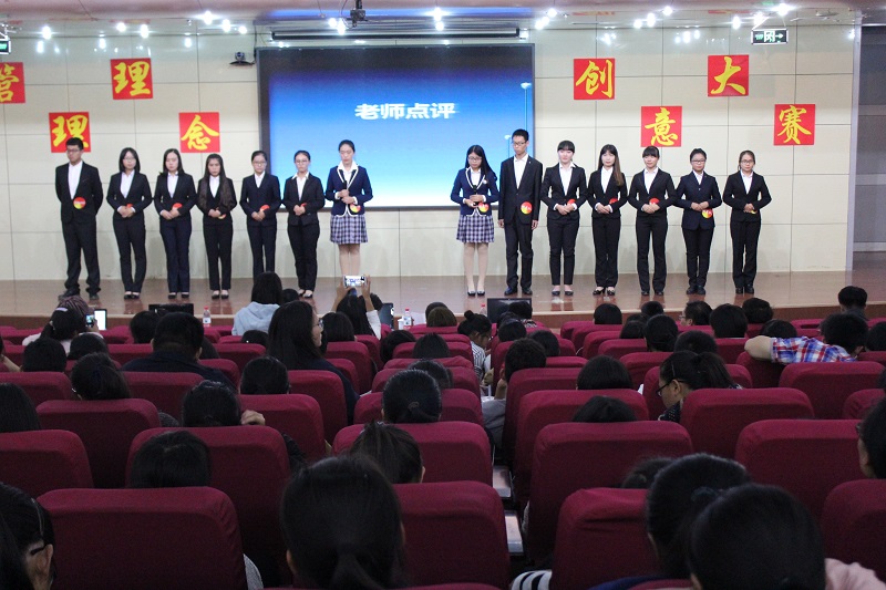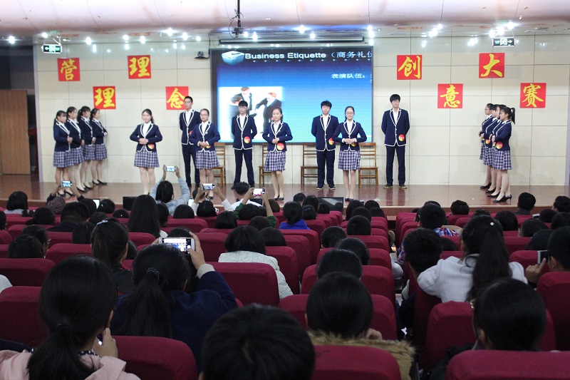 伴着主持人的介绍,职场的走秀、商务礼仪的展示和同学们精心准备的话剧拉开了大赛的帷幕,随后各队主讲人依次上台介绍自己的研究课题,用 PPT展示团队研究成果。介绍完毕后,每队同学回答了老师们提出的专业性问题,同学们优秀的现场应变能力和知识运用能力赢得了观众们的阵阵掌声。主持人与观众互动问答的环节将现场气氛推向了最高点,使同学们在幽默的氛围中学习到了管理及传统文化小知识。最后,新青年队摘得桂冠。