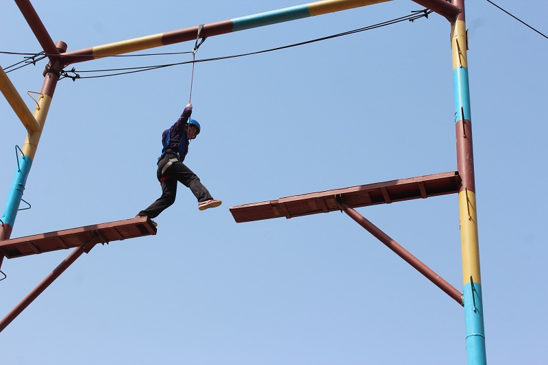 24日6:40,迎着清晨明媚的阳光,大家准时集合登山晨练。上午的项目安排是“信任背摔”和“高空断桥”环节,针对团队信任和挑战自我两方面对同学们展开特训。在团队成员“我们相信你,我们爱你”的鼓励声中,挑战者努力克服内心的恐惧与不自信,圆满完成任务。高空断桥让所有队员都捏了一把汗,但伴随着同学们阵阵鼓励声,所有队员克服心中恐惧,勇敢走上了八米高台,完成了飞跃。