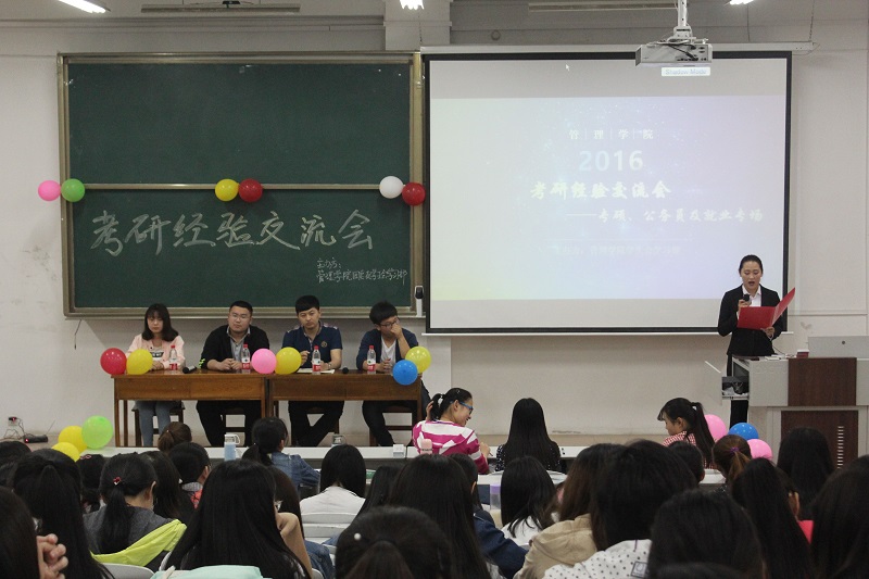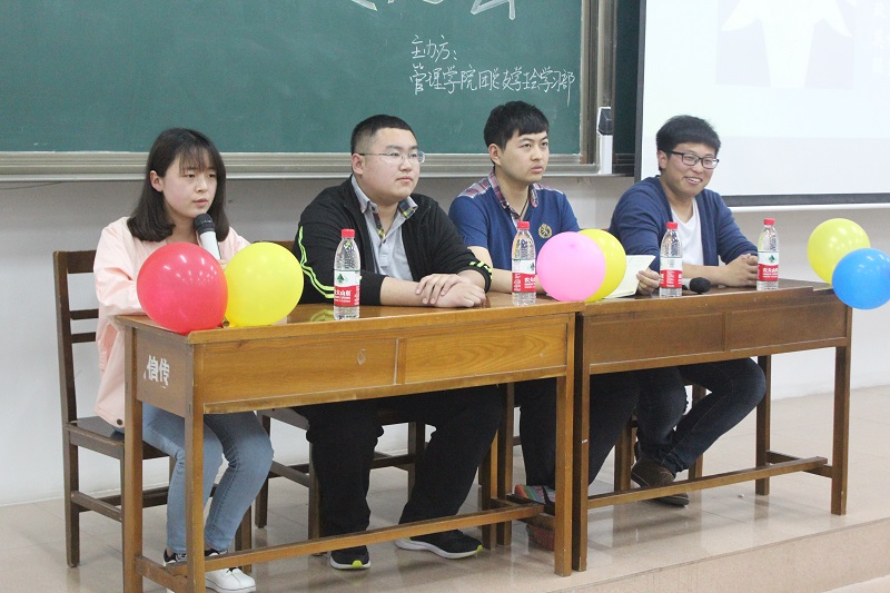 经验会伊始,主持人向同学们介绍了参加此次活动的宋哲、牛宗林、张言、陈靖心四位师哥师姐。首先,他们重点在专硕方面进行讲解,提出最重要的就是正答率,而且比学硕更有风险,要拿出往年学校数据做参考。在准备阶段,要给每个科目的难易有个好的定位,难易程度要自己把握不能道听途说。同时,他们也讲了自己对复试时的感受,并建议同学们在复试时保持镇定,不要紧张。在学习方面,他们指出,同学们要打好平时的基础,稳中求进,不要“临时抱佛脚”,那样只会收效甚微,尤其在英语方面,平日的单词量是考研初试时的保障。他们也指出,在会计方面竞争激烈,应在应试前做好充分准备,不可大意。而且在考试时,尤其是数学,时间非常紧迫,应当掌握科目的技巧,注意科目特有的逻辑。他们幽默诙谐的语言使同学们在轻松的氛围下了解了考研的技巧和经验,交流会在掌声中圆满结束。