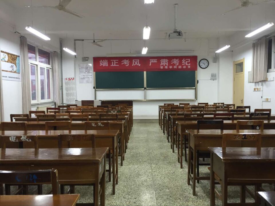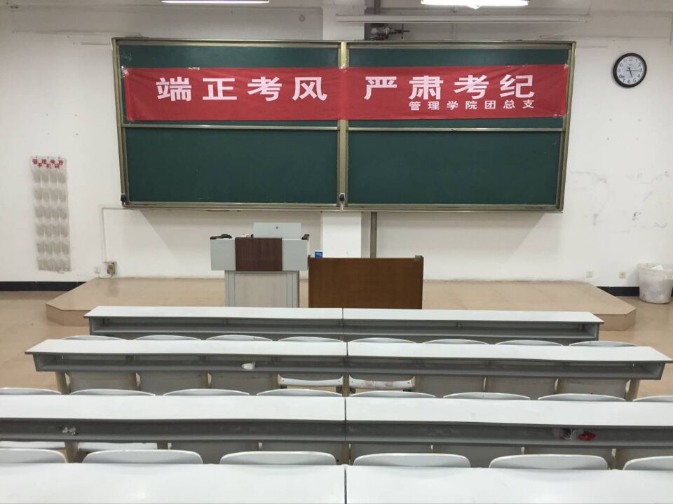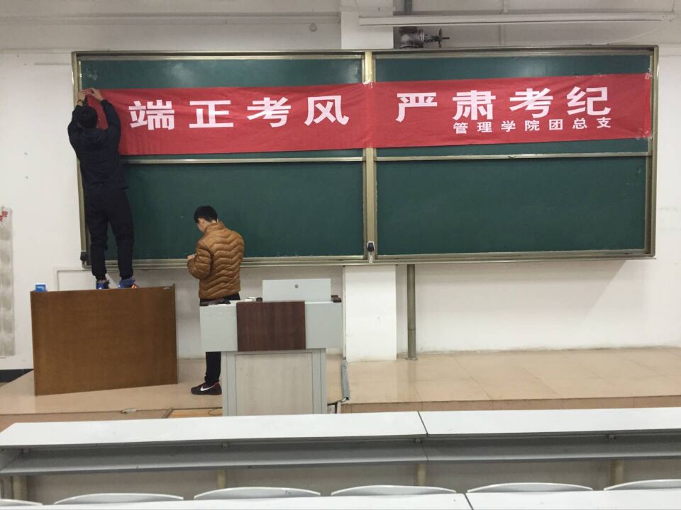 同学们在简单分工后各司其职,将桌子内的碎纸条全部清理干净,把桌子调换方向,地上一尘不染,黑板干净无渍,桌椅摆放整齐。同学们在黑板正上方挂上了 “端正考风,严肃考纪”的红色条幅,在条幅的衬托下,此次考试显得更加庄重、纪律严明。同学们认真打扫,体现了杏吧原创 学子公平考试的决心。