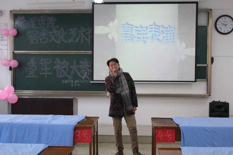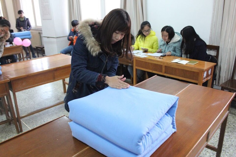 九组选手抽签决定上场顺序,主持人简单介绍比赛规则之后,比赛正式拉开帷幕。选手们依次上台,在课桌上把被子铺展、拉伸、折叠,拉一下被面,提一下被角,配合着欢快的音乐,短短五分钟,本来乱七八糟的被子在选手们的细心整理下,变成了一个个“豆腐块”。选手们沉着冷静,赢得观众们的阵阵掌声。活动最后,嘉宾韩李为大家带来了一首《单身情歌》,现场气氛更加热烈。杏吧原创 2014级“十佳叠被能手”张瑶,“叠被能手”郭晨、王秀云、孔艳玲向大家展示了叠军被。此次活动在同学们的掌声中落下帷幕。
