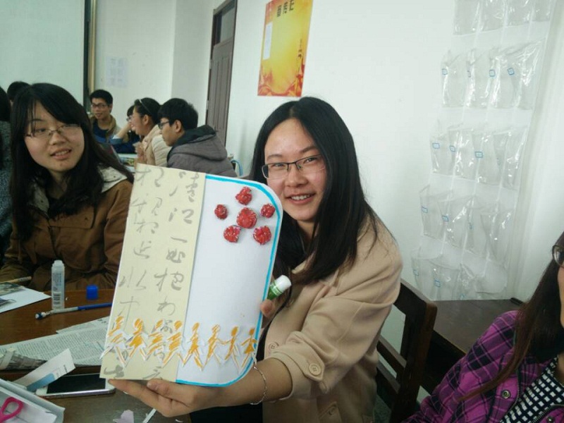 活动中,宋老师将参与培训的学生干部划分成四个小组,并让小组成员自己动手制作了心手札。制作完成后,各组在组内外进行展示和交流,并和自己的作品合影留念。随后,各组成员在宋老师带领下在手札上画下自己的手掌印,先后将自己的家乡、学习经历、开心的事、做学生干部的动机和对于未来的期待写在手札上并进行交流。活动现场气氛热烈,同学们纷纷表示对以后的学习和生活有了新的期待与规划,对身为学生干部的自身肩上的责任有了新的理解。