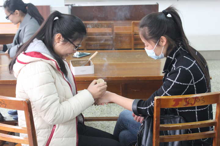 活动伊始 ,主持人姜浩简单介绍了此次活动的目的及流程,之后由四位接受过专业培训的志愿者们为同学们依次进行志愿艾灸服务,志愿者通过熟练的持灸动作,向到场的体验者展示何为艾灸并就艾灸的功用和相关的穴位进行了讲解。志愿者艾灸投入、认真,赢得了在场同学的一致好评。活动有条不紊地进行,同学们切身感受到艾灸带来的温暖、舒适与平心静气之感。