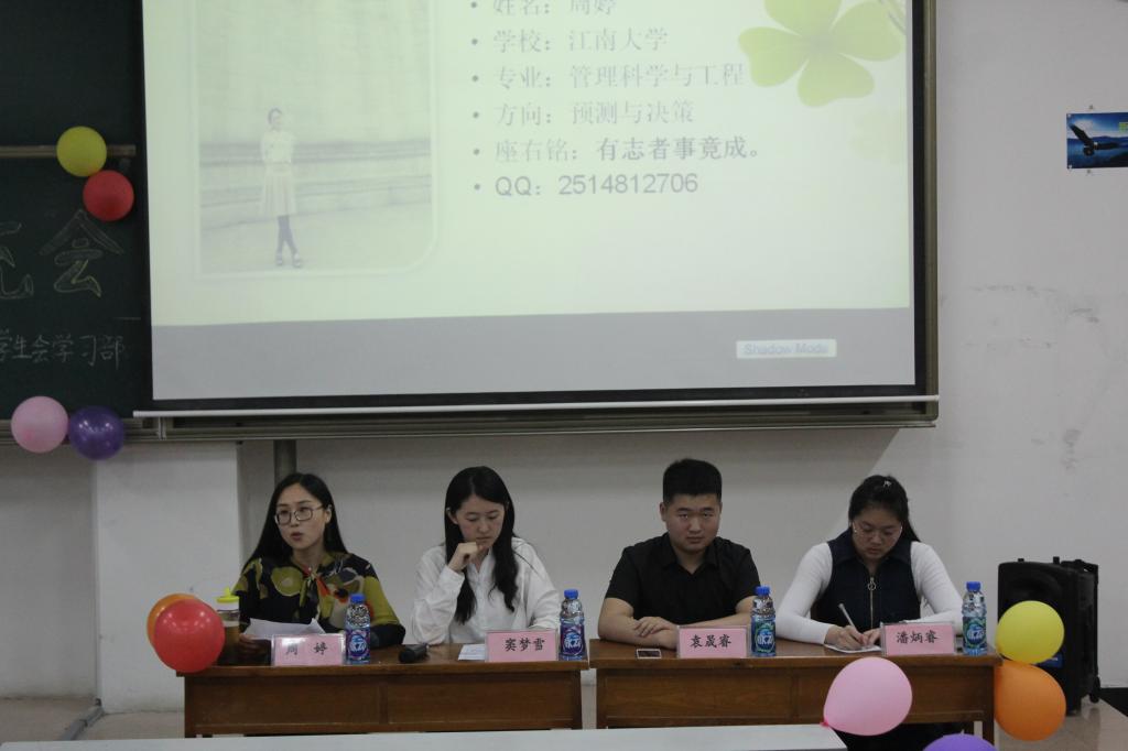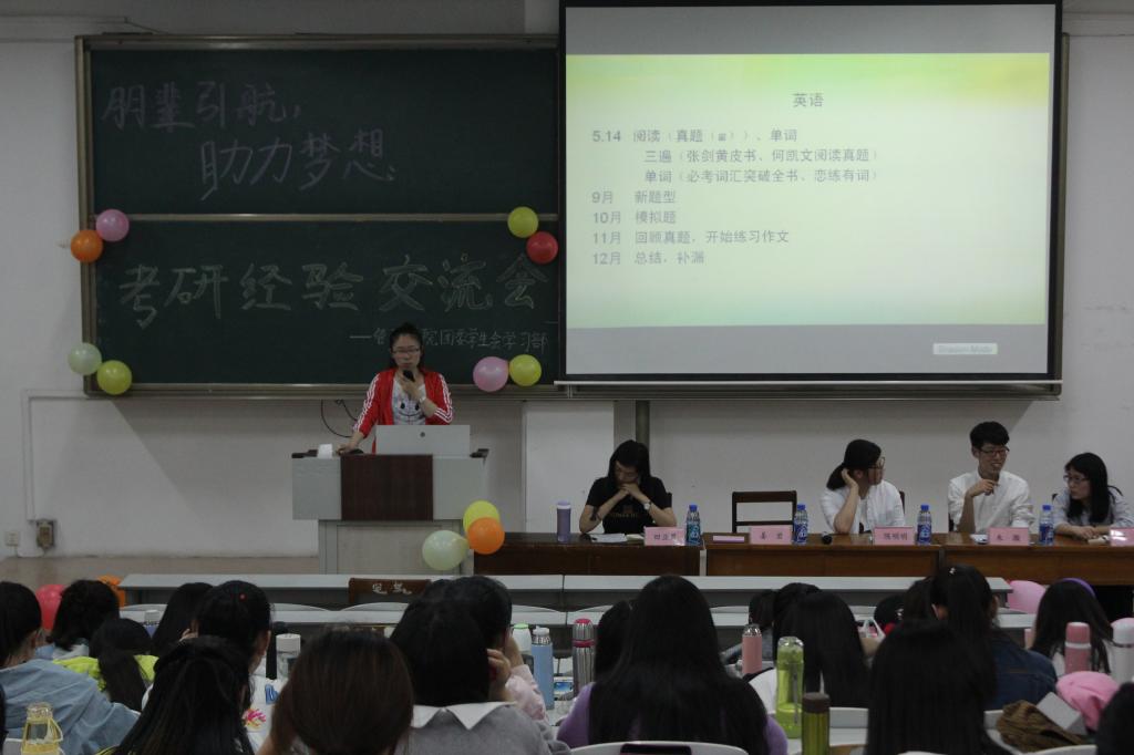 5月13日19:00,在主持人的简短介绍下,经验交流会正式开始。首先发言的是考取北京工商大学的陈明明,她详细而又条理地从考研四个科目的角度讲起,毫不吝啬地向大家分享自己的复习计划与考研策略。紧接着是被南京财经大学录取的姜岩着重就英语、政治两个科目的学习方针进行了讲述,在座同学纷纷拿笔记录。随后,田亚男和朱灏也依次向同学们分享了自己的考研历程。最后,在韩晶对前几位发言人进行补充后,考研经验交流会第一场圆满结束。