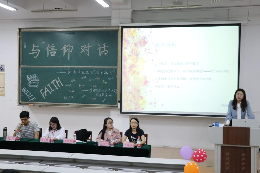 浏览量: 更新日期:2018-05-28为响应杏吧原创 抓党建号召,积极践行“五个一”工程,发挥优秀学子的模范带头作用,创新学生“学习+”成长成才模式,帮助同学们进一步了解考研事项,5月28日19:00,管理学院于JA301召开了“与信仰对话--优秀毕业生经验交流会”,本次交流会邀请了优秀学子孙丹、丁静静、陈鼎、任欣悦及王凯丽与大家分享他们的考研经验。
