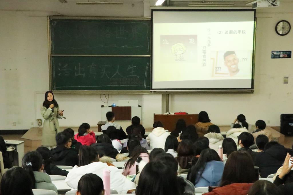 讲座从网瘾形成的神经心理过程、原因及如何走出虚拟世界三个方面进行宣讲。李柯利用“网瘾女生当众殴打父母”这一典型案例,告知大家长期沉迷网络的危害,随后又通过理论与视频相结合的方式,深入浅出地阐述了“网瘾”对青年学生在身体健康、人际交往、学业、行为等方面的负面影响,以此告诫同学们要养成良好的上网习惯,增强自制力,远离网瘾。