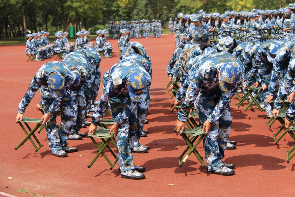 训练场上,抬头望去,同学们穿着整齐的军装,满怀激情的学习站军姿、稍息、立正等基本项目,他们以蓬勃的朝气和饱满的热情,全身心的投入军训。教官们亲自分解、示范、指导每一个动作,从握拳到绷脚,教官始终严格把关。他们希望用最严格的训练锻炼学生最坚强的意志,希望军魂精神能够贯穿他们的大学生活。