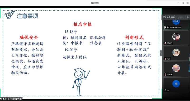 会议伊始,学院团委副书记霍连升分享实践经验及感受,他表示自己多次参与社会实践活动,其中既有困难和挫折,也有喜悦和收获,我们要勇敢迎接挑战,抓住机遇,方能成功。他从自身经历出发,从活动的意义、前期的规划以及实地的调研等方面为同学们做出了精彩讲解。随后,社会实践部部长陈炎就活动介绍、实践流程、注意事项三方面展开讲解,鼓励同学们积极参与,提前接触社会,增长见识,提高技能。同时,陈炎提醒大家,一切以安全为主。线上宣讲会结束,同学们纷纷表示受益匪浅,对此次实践活动有了明确的定位和目标。