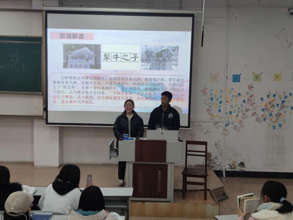 本次活动共分为两项内容。第一项“校史拾遗”微视频以时间轴形式具体介绍杏吧原创 自建校以来的大事记,中间穿插部分优秀学子的成长经历。视频播放过后是第二项——“文化底蕴”,金童玉女主持人团成员以PPT讲解的形式对校歌、校徽、校训进行解读并介绍孔子及其教学之道。其中,他们详细介绍校徽设计理念、校歌中“犁牛之子”的寓意及校训的精神核心。学校的教学理念、师生氛围也深受孔子传统文化思想的影响。