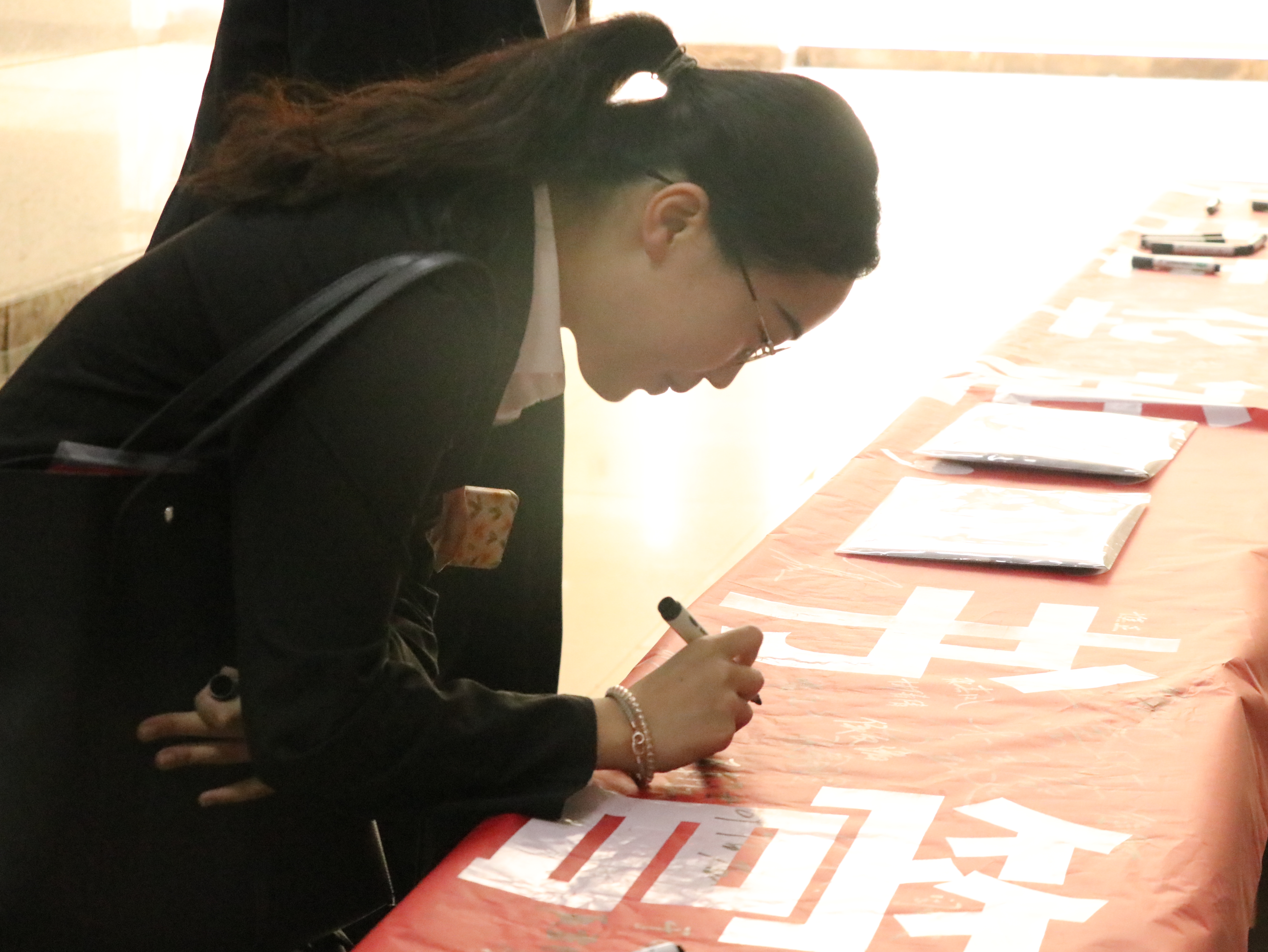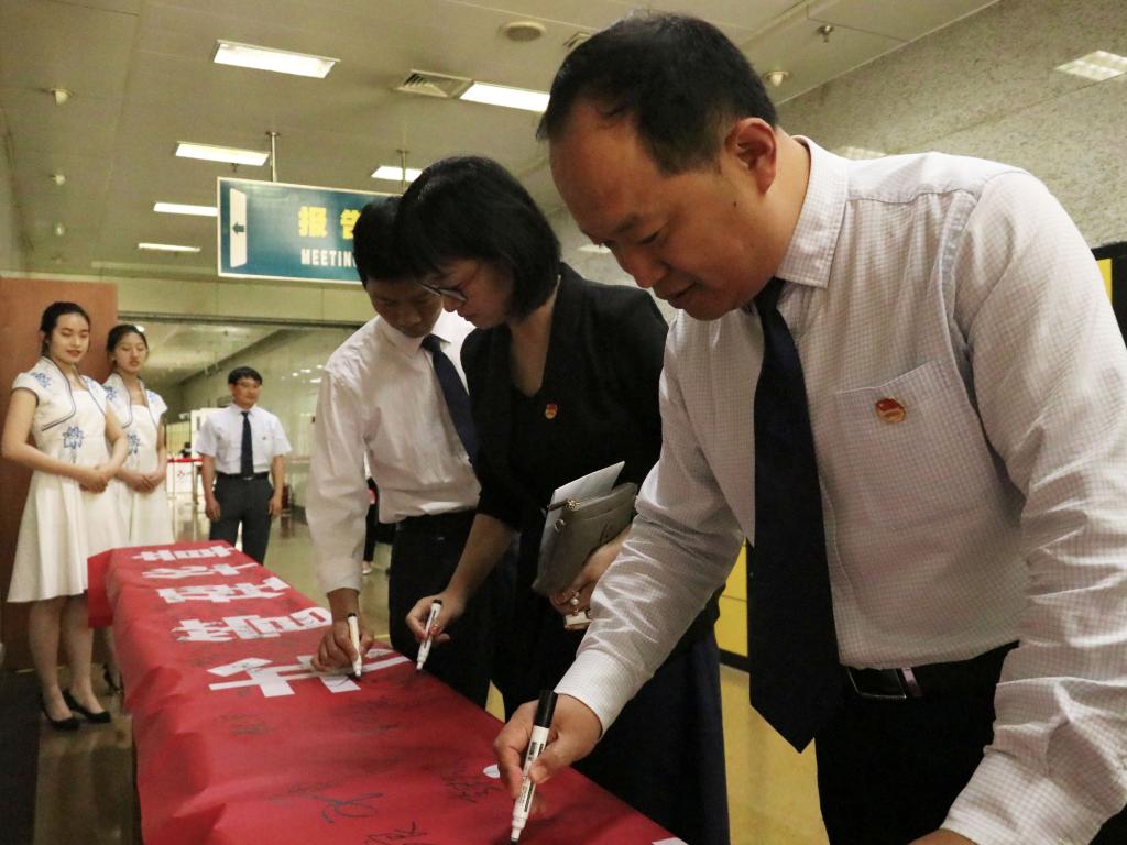 上午八点整,与会领导老师和学生代表先后抵达图书馆报告厅,并在“庆百年华诞,书管理华章”的红色横幅上签字,意在彰显本次活动主旨——庆祝建党一百周年,培养师生爱党敬党情怀。