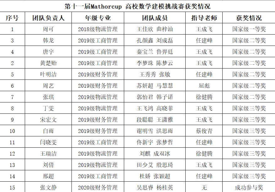 据悉,MathorCup高校数学建模挑战赛是由中国优选法统筹法与经济数学研究会主办的面向全日制普通高等院校在校学生的学科竞赛活动。此次比赛过程中,参赛团队大显身手,开拓思维,通过分析题目、认真讨论、查阅资料、编程实验,不断优化模型,撰写相关论文。同时,指导教师凭借丰富经验,对参赛团队悉心指导,最终各支队伍均取得优异成绩。