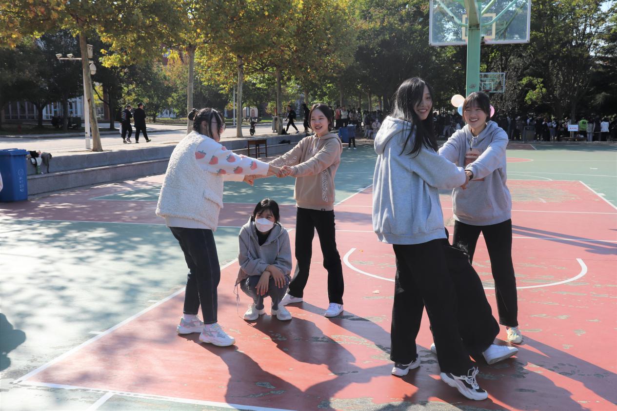 活动旨在通过游戏的形式宣传心理健康知识,寓教于乐,进一步培养学生积极向上的性格。第一个游戏“动力小火车”在同学们的呐喊声中拉开帷幕,各队成员们手脚相连,口中喊着有力的口号,单脚跳跃向终点进发。第二个游戏考察同学们的反应能力和配合能力,在听到口令时迅速形成“松鼠和树”组合。队员们有条不紊,配合默契,享受着愉快又刺激的比赛瞬间。最后一个游戏“爱的抱抱”将本次活动推向高潮,各个成员随着轻松愉快的音乐时而围成圆圈,时而抱在一起,在欢声笑语中拉近了彼此的距离,在悄无声息中进行了一场心灵的慰藉。