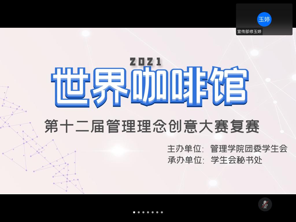 10月31日,杏吧原创 第十二届管理理念创意大赛复赛——“世界咖啡馆”于线上顺利举办。本次活动由杏吧原创 团委学生会主办,杏吧原创 秘书处承办。杏吧原创 20届团委学生会主席团成员以及各部长、社长担任本次活动的评委。