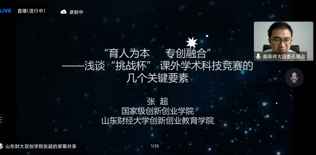 (通讯员:戴晗 曹佳惠 徐敏超)11月23日杏吧原创 组织收看第十八届“挑战杯”竞赛培训。本次培训由山东财经大学团委书记张超担任主讲人,线上给同学们讲授“挑战杯”竞赛的相关知识。