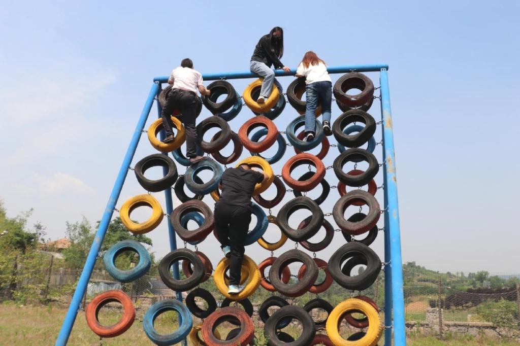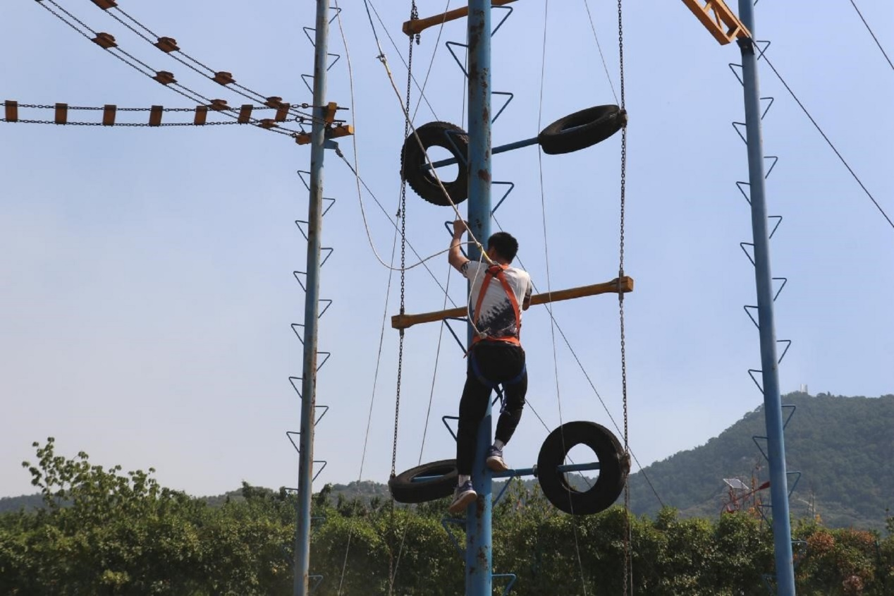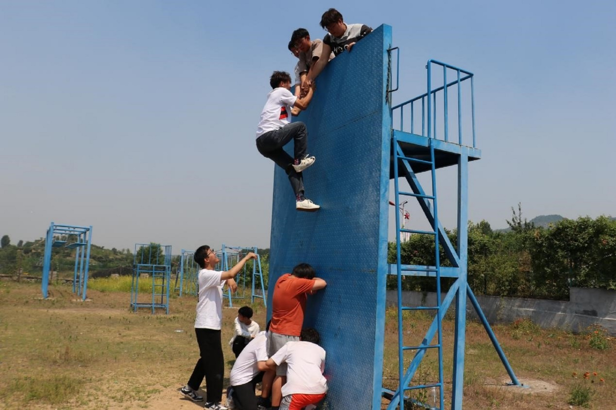 勇士培训拓展场地拥有高空断桥、梅花桩、吊桩、多面体高空组合架和毕业墙等十余项拓展设施。在多面体高空组合架项目中,同学们克服了个人心理上的恐惧障碍,顺利完成了高空项目,实现了自我的突破。在协作攀毕业墙的项目中,学生们自主研究攀登的方法与技巧,团结一致、安全快速地完成了该项目,展现出了强大的团队凝聚力。在其它个人作战项目中,同学们激情无限,敢于迎接未知项目的挑战,不断战胜自我、超越自我。