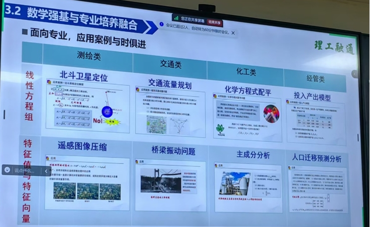 报告中,刘洪霞教授首先以基于学生个性化需求打造数字化资源和智慧树教学平台为例分享了国家一流本科课程《线性代数》建设方面的经验和做法,随后就大学数学教学过程中存在的“数学知识与专业应用脱节”、“内容抽象导致思政融入困难”等问题,给出了以混合式教学重构教学内容推动共性教育与个性学习融合,以理工融通、学科交叉实现数学强基与专业培养融合,以数学文化为切入口实现全链路育人、构建CSIL课程思政育人模式的经验和做法。