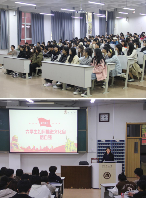 本次宣讲会紧密围绕“推进文化自信自强”和“全过程人民民主”两个主题展开。宣讲员首先讲解了推进文化自信自强的重要性和必要性,从为什么要推进文化自信自强、如何推进文化自信自强以及大学生应如何推进文化自信自强三个方面进行了深入剖析;会上强调,全面建设社会主义现代化国家,必须坚定不移地走中国特色社会主义文化发展道路,不断增强文化自信,围绕举旗帜、聚民心、育新人、兴文化、展形象的使命任务,努力建设社会主义文化强国;最后,宣讲员将焦点转向全过程人民民主,从总体论述与原则的角度出发,对全过程人民民主的广泛性、真实性、系统性和整体性进行了详细阐述。