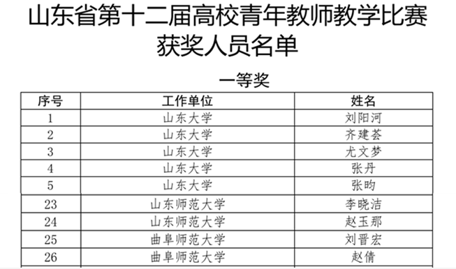 浏览量: 更新日期:2025-05-23近日,山东省第十二届青年教师教学比赛落下帷幕,我院刘晋宏荣获一等奖。这是继刘金发教授2019年获山东省第六届青年教师教学比赛一等奖之后的又一荣誉。