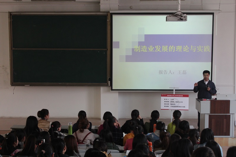 王磊老师对此次报告的题目进行了简单的解释,他以两会期间的“十三五”规划为导引,向同学们介绍此次报告主题。紧接着,他针对我国宏观经济发展及改革措施,解读了我国经济速度放缓急需改革的现状,并以2008年金融危机为例强调了供给侧改革势在必行。随后,王磊教授就工业4.0提出了制造业发展战略,探讨了供给协调论、劳动分工论、资源整合论、天人合一论等相关理论。最后,王磊老师以列举的方式一一介绍了运营方式变革的实践。同学们座无虚席,认真听讲。