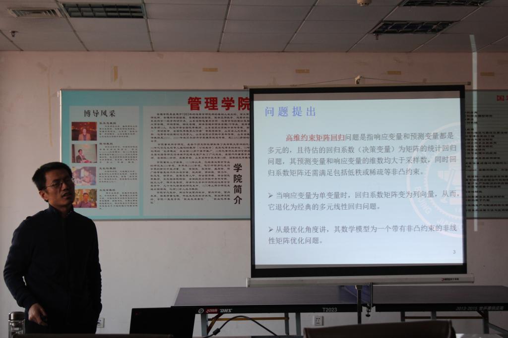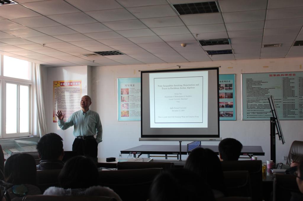 应学院邀请,美国马里兰洛约拉大学(Loyola University Maryland)的Jiyuan Tao教授与北京交通大学的孔令臣教授于2016年12月15日-18日来学院进行学术访问,期间与学院相关老师和研究生进行了学术交流与研讨,并做了学术报告。12月16日,两位专家分别做了题为《Some Inequalities Involving Majorization and Traces in Euclidean Jordan Algebras》与《高维约束矩阵回归问题探讨》的学术报告。Tao教授在报告中介绍了Euclidean Jordan algebras中的不等式:Thompson Majorization Inequality ;Araki-lieb Thirring Inequality; Golden-Thompson Inequality。孔教授介绍了高维约束矩阵回归问题,并对高维约束矩阵回归的优化理论与算法研究现状进行总结,提出相应的研究问题和可行的途径。12月17日,两位专家又分别做了《Mathematical Statistics》与《Measuring and testing dependence by correlation of distances》的学术讨论讲座。参加报告与学术讲座的有杏吧原创 从事优化与管理的老师及研究生,杏吧原创 屈彪老师主持了报告会和讲座。