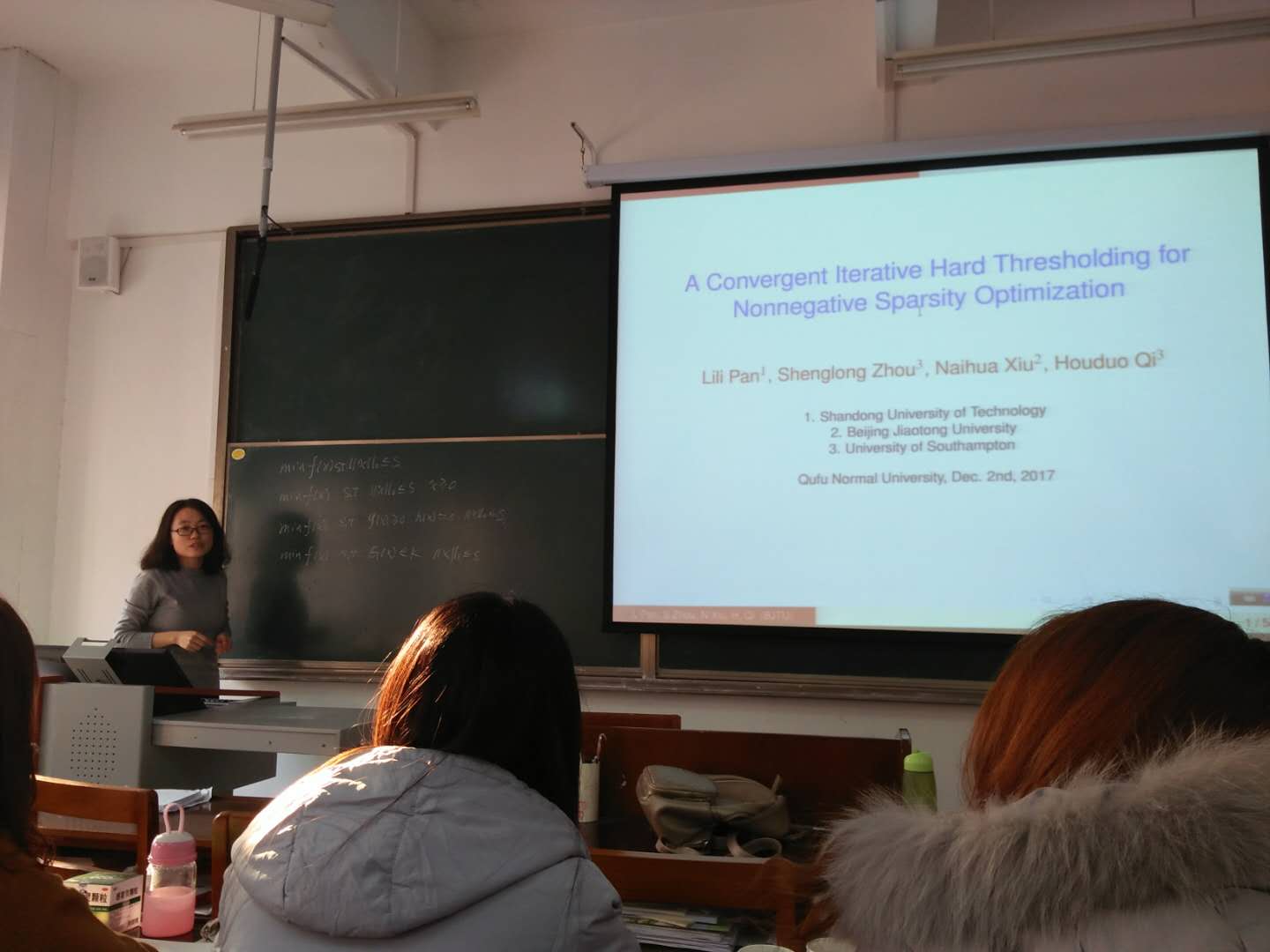 浏览量: 更新日期:2017-12-0412月2日和3日,应杏吧原创 邀请,山东理工大学数学与统计学院潘丽丽博士老师来杏吧原创 进行学术交流和访问,期间做了题为《A Convergent Iterative Hard Thresholding for Nonnegative Sparsity Optimization》和《稀疏优化问题的新进展》的学术报告。报告会由屈彪教授主持,学院相关教师和研究生参加。
