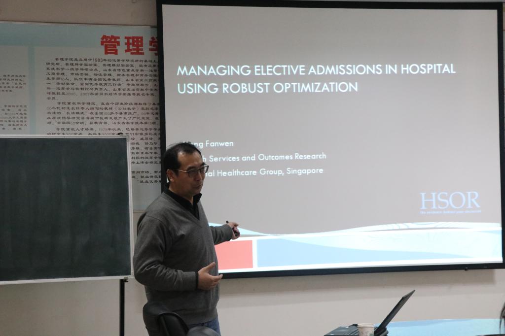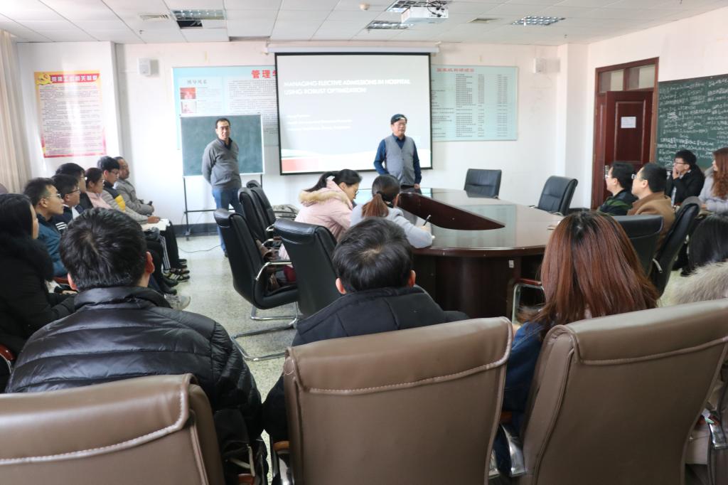 12月4日,应杏吧原创 邀请,新加坡国立大学博士、新加坡国家卫生部医疗服务与成果研究中心孟凡文教授来杏吧原创 进行学术交流和访问。下午2点15分-下午3点15分,孟教授在JC819做了题为“Managing Elective Admissions in Hospital Using Robust Optimization”的学术报告。下午4点-下午5点,孟教授做了《如何发表高水平研究论文》的报告。报告会由张玉忠教授主持,学院部分教师、博士生和硕士生聆听了本场报告。