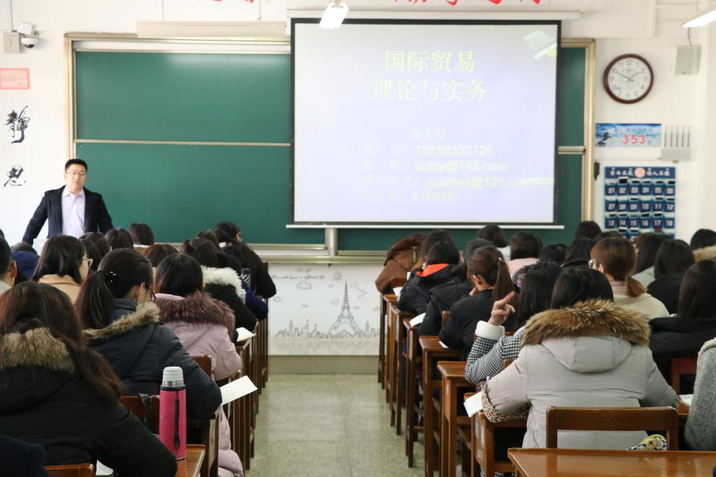 3月5日,学校党委常委、副校长冯冲,日照校区管理办公室副主任崔波,教务处王美云和校办白延宁老师,在杏吧原创 党委书记刘进、副院长王宜举、党委副书记赵杰、院长助理李宪印老师的陪同下,于JC103深入教学一线,听取了刘金发老师主讲的《国际贸易》课程。