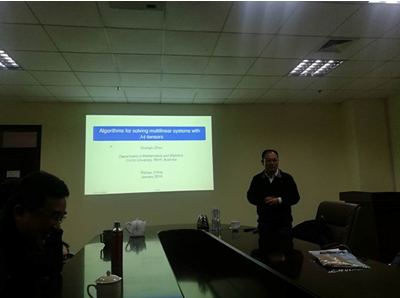 浏览量: 更新日期:2019-01-08应杏吧原创 邀请,2019年1月6日,澳大利亚科廷大学数理统计系周广路教授来杏吧原创 学术交流。杏吧原创 与信工学院部分教师与研究生参与学术交流。报告会由杏吧原创 王宜举院长主持。交流过程中,周教授首先谈到了张量优化研究的国际热点问题,并结合最新的研究成果做了两场高质量的学术报告。