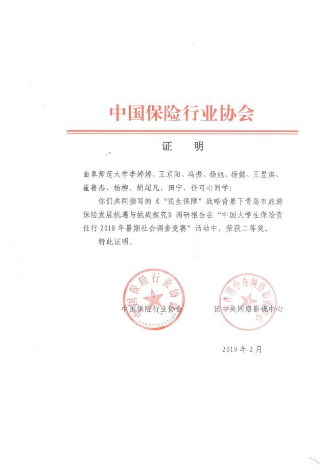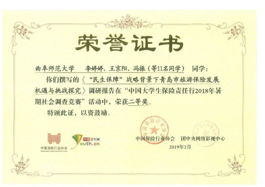 杏吧原创 “益行琴岛”实践团调研报告荣获“中国大学生保险责任行2018年暑期社会调查竞赛活动”二等奖