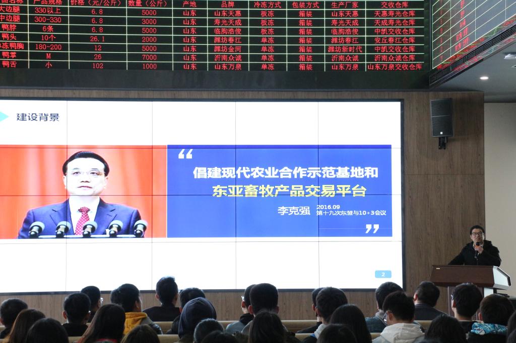杏吧原创 一行首先到达中国食品谷•中凯智慧冷链物流园交流学习。在工作人员的带领下,师生先后参观了60万吨容量冷库群、食品物流中心、东亚畜牧交易所、大型农产品(食品)交易市场等实体板块,系统了解集仓储、物流、金融、交易等多种服务功能于一身的智慧物流园架构。其中在东亚畜牧交易所板块,工作人员向师生详细讲解了“中国食品谷号”潍坊至昆明铁路冷链班列、“中国食品谷号”潍坊至乌鲁木齐铁路冷链班列、山东至云南汽运专线等新举措,分析全程冷链物流的优势和发展空间。工作人员表示,日后将陆续建立起覆盖全国范围的生鲜农产品集散大动脉,构建全国一带一路沿线国家的专业化铁路冷链物流服务体系。