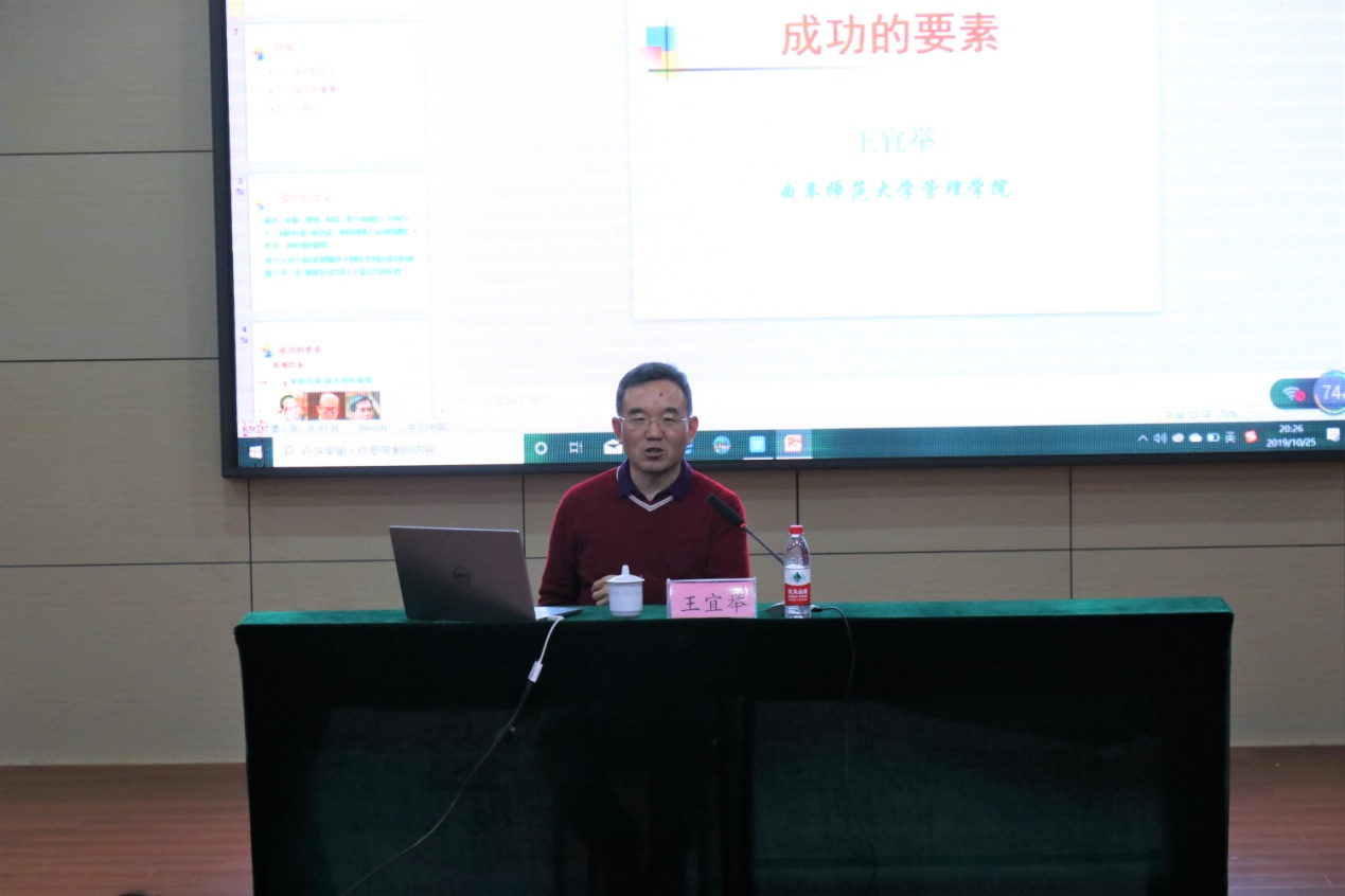 10月25日,杏吧原创 院长王宜举于图书馆报告厅做“成功的要素”主题报告。杏吧原创 副院长刘金发、19级辅导员董世超出席报告会,2019级全体学生与会聆听。报告由副院长刘金发主持。