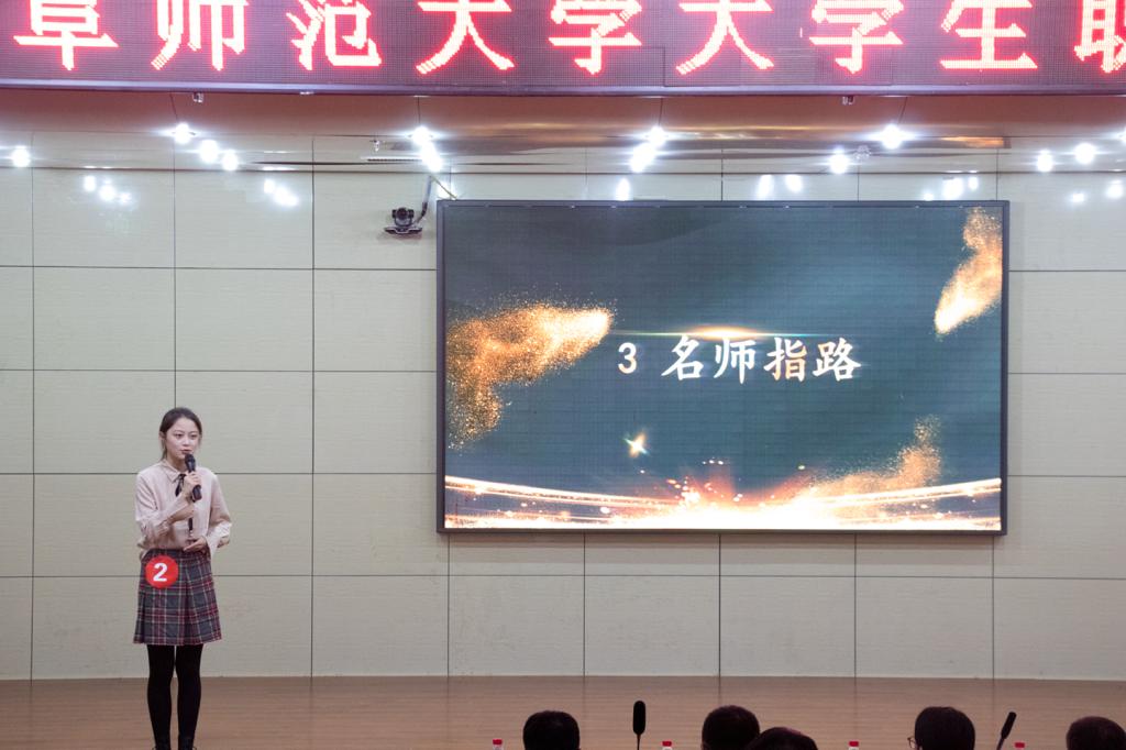 决赛共分为三个环节:“初现风采”、“情景模拟”与“名师指路”。第一环节,参赛选手按照抽签编号依次上台展示VCR,并借助PPT进行主题陈述,最后由评委老师进行评分。第二环节,八位晋级选手依次围绕“目标职业典型工作情景”自编短剧,阐明工作情景中的矛盾点并解决问题、展示自己的职业价值观。第三环节,由评委对选手进行现场提问,选手们思维敏捷、逻辑清晰、机智应变,全方面展示个人对目标职业的理解。