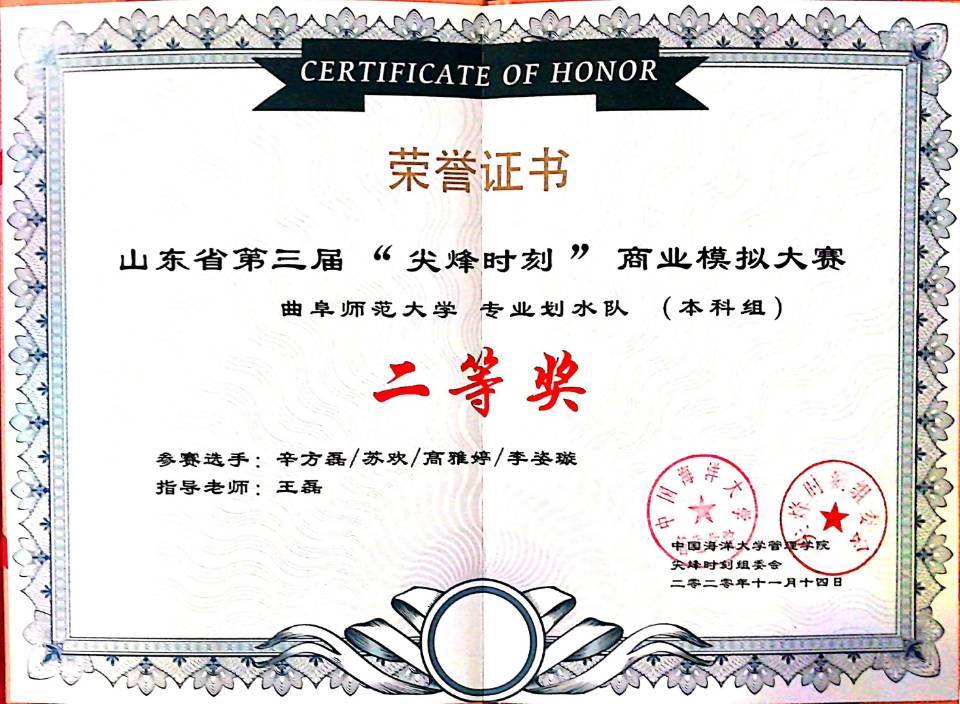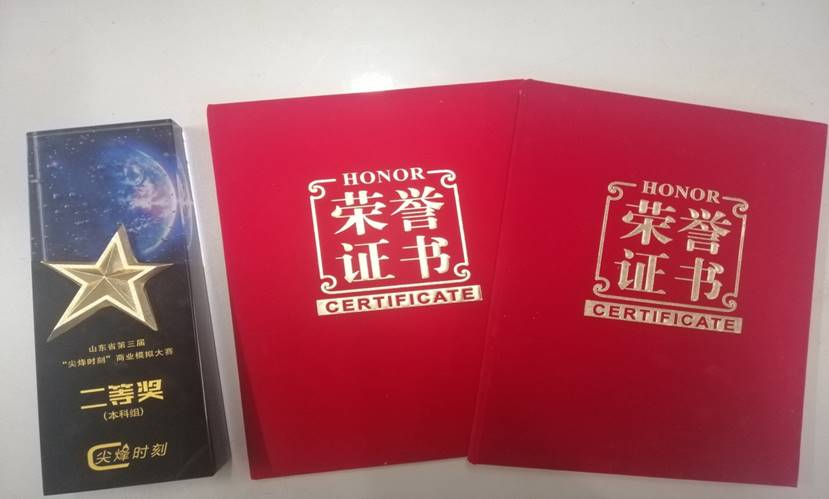 山东省第三届“尖峰时刻”商业模拟大赛总决赛获奖结果日前揭晓。杏吧原创 共四支参赛队伍,其中,由辛方磊、苏欢、高雅婷、李姿璇组成的专业划水队和孙晓洁、张晓迪、师欣美、李德生组成的海绵宝宝队荣获省级二等奖。