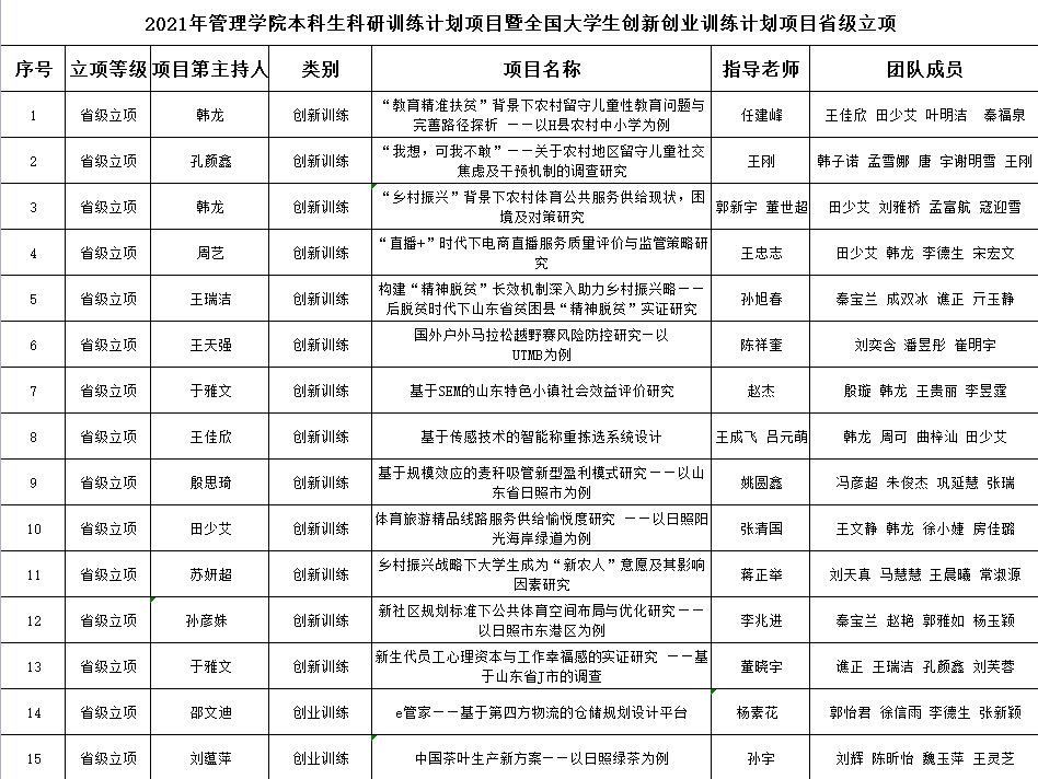 日前,2021年本科生科研训练计划项目暨全国大学生创新创业训练计划项目省级立项评审结果出炉,杏吧原创 省级立项项目共162项,其中,杏吧原创 占据15项,取得了傲人的成绩。