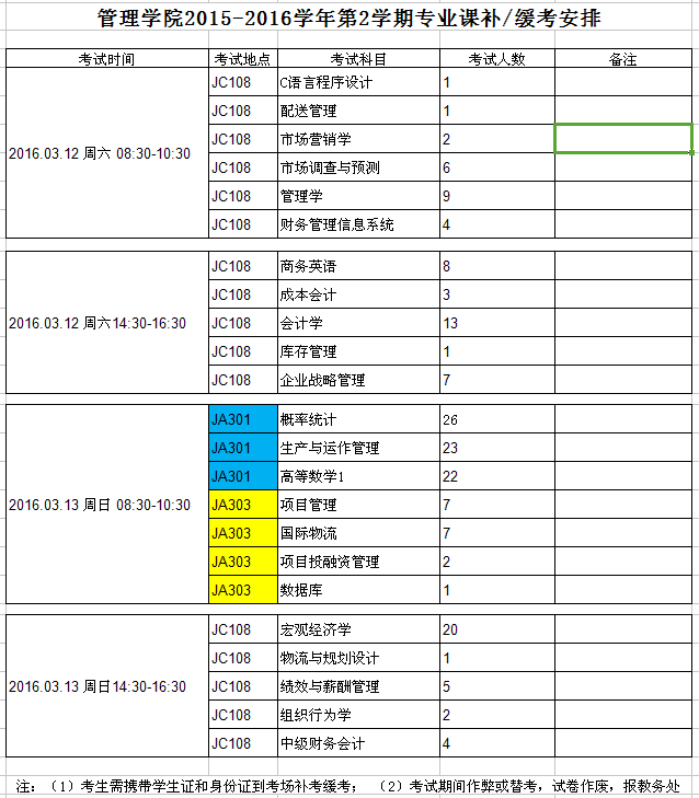 学院定于2016年3月12(周六),13日(周日),组织专业课补/缓考;