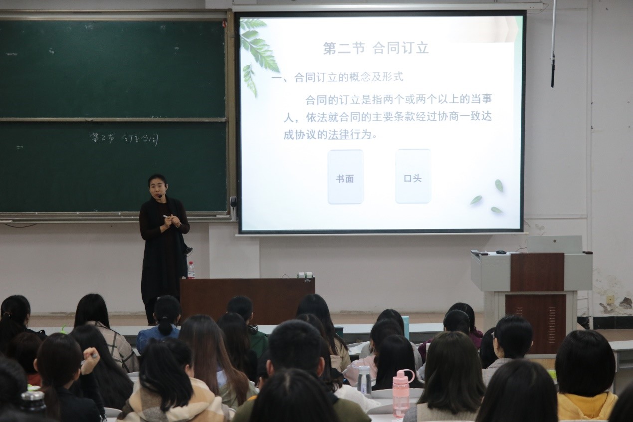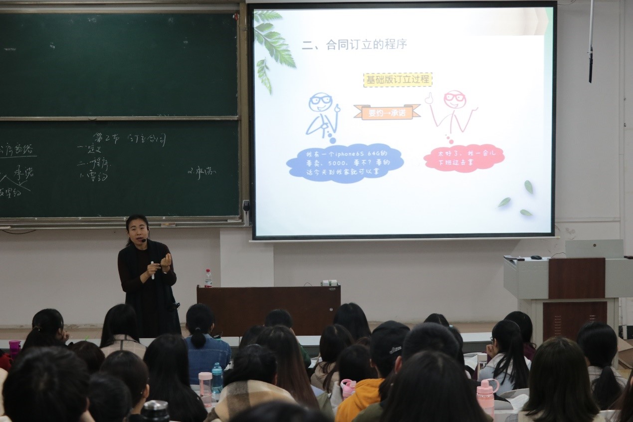 课堂伊始,姚老师以一则幽默风趣的古代案例引出了经济法中专业名词——“合同订立”的概念,充分地调动了课堂氛围;课上,姚老师以扎实的专业知识为主,清晰美观的PPT为辅,深度分析剖解经济法中的知识要点及难点,增强了学生的理解;同时她十分尊重学生在学习中的主体地位,充分调动学生思维,引导学生积极思考、大胆探究,注重挖掘学生潜能,灵活地将理论知识与实际相结合,将繁杂的知识简单化、枯燥的知识生动化,进一步巩固了学生对知识的掌握,获得了听课老师的一致好评。