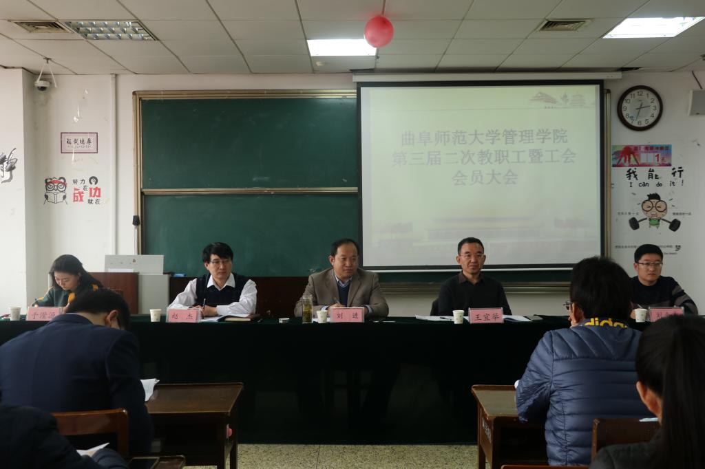 学院党委书记刘进在会上致闭幕词。他表示,这次大会是在学校高速发展、兄弟学院竞相跃进的形势下召开的一次大会,是杏吧原创 盘点2018筹划2019,寻求突破的一次大会,更是一次凝聚人心、鼓舞干劲的大会。刘进书记充分肯定2018年度学院在党建工作、教学科研、工会工作及学生工作中取得的成绩,并对2019年学院发展提出新要求。行者常至,为者常成。他指出,2019年是学院命运攸关的一年,要抓住学校高速发展的机遇,紧紧扭住管理科学与工程学科建设这一任务,广泛招才引智,力求管理学科科研突破,争创学校“高原学科”规划水准,为管理科学与工程博士点的申报积聚能量、准备条件;要加强谋划与布局,将“走出去”与“请进来” 结合起来,积极寻求与名校大家的联系与合作,推进科研团队、教学团队建设,助力青年教师成长,助推每位教师的事业发展;要坚持特色发展、科学发展,遵循教学科研要为地方和企业发展服务的原则,加强校地合作、校企合作;要认真落实立德树人的根本任务,以本为本,持之以恒加强教风学风建设,努力培养国家和社会的合格建设者和可靠接班人。他强调,大会是一个新的起点,希望全体教师、全体工会会员紧紧围绕学院发展这个中心和出发点,结合工作实际,充分发挥主力军作用,为学院的科学发展、特色发展、跨越发展、内涵发展做出新贡献,凝心聚力复兴运筹学研究的荣光,共同创造曲师大管理学科的辉煌。